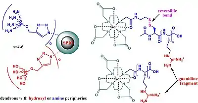 SPIO nanoparticles confer high sensitivity in MRI but they have lower affinity for cells; they work at high concentrations. Functionalizations of these compounds using dendrimeric guanidines showed similar activities as TAT-based CPPs but higher toxicity. New substrates based on dendrons with hydroxyl or amine peripheries show low toxicity. Applications of SPIO includes cell labeling in vivo; due to low toxicity, they are clinically approved for use in liver, spleen, and gastrointestinal imaging.[82]