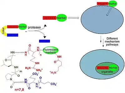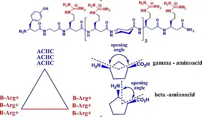 CPPs found applications as transporters of contrast agents across plasma membranes. These contrast agents are able to label the tumor cells, making the compounds important tools in cancer diagnosis; they are also used in in vivo and in vitro cellular experiments. The most important classes of CPP are isolated from viruses, such as TAT (transactivated-transcription) derived from HIV-1, penetratin, and transportan. The most widely used CPPs are based on TAT derivatives. TAT is an arginine-rich CPP. Several improvements for this substrate includes the usage of unnatural β or γ amino acids. This strategy offers multiple advantages, such resistance to proteolytic degradation, a natural degradation process by which peptide bonds are hydrolyzed to amino acids. Unnatural acid insertion in the peptide chain has multiple advantages. It facilitates the formation of stable foldamers with distinct secondary structure.[62][63][64] β-Peptides are conformationally more stable in aqueous solution than naturally occurring peptides, especially for small chains. The secondary structure is reinforced by the presence of a rigid β-amino acid, which contains cyclohexane or cyclopentane fragments. These fragments generate a more rigid structure and influence the opening angle of the foldamer. These features are important for new peptide design. Helical β-peptides mimic antimicrobial activities of host defense peptides.[65][66][67] This feature requires the orientation of cationic –hydrophilic on one side, and hydrophobic residues on the other side of the helix. The attachment of fluorescent group on one head of the molecule confers contrast properties. A new strategy to enhance the cellular up-take capacity of CPP is based on association of polycationic and polyanionic domains that are separated by a linker. Cellular association of polycationic residues (polyarginine) with negatively charged membrane cells is effectively blocked by the presence of polyanionic residue (poly-glutamic acid) and the linker, which confer the proper distance between these two charged residues in order to maximize their interaction. These peptides adopt hairpin structure, confirmed by overhauser effect correlation for proton-proton proximities of the two charged moieties. At this stage only the linker is exposed to protease hydrolysis in vivo applications. The linker hydrolysis occur and the two charged fragments experience more conformational freedom. In the absence of linker, the cationic peptide can interact more efficient with the target cell and cellular uptake occurs before proteolysis. This strategy found applications in labeling tumor cells in vivo. Tumor cells were marked in minutes. Linker degradation can be predicted by the amount of D-aminoacids (the unnatural isomer) incorporated in the peptide chain, this restricts in vivo proteolysis to the central linker.[68][69][70][71]