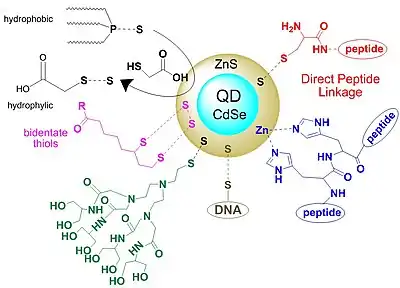 Quantum dots are colloidal nanocrystals, based on a cadmium-selenium (CdSe) core covered with a zinc-sulfur (ZnS) layer. This substrate has been used intensively as a cellular marker because CdSe emits in the visible domain and is an excellent contrast agent, while the ZnS layer protects the core from oxidation and also the leeching of CdSe into the surrounding solution. This strategy also improves the photo-luminescence yield. The properties can be tuned by the thickness of the ZnS protective layers. Colloidal QD emission can be modulated from UV-Vis to the infrared by using different types of coating agents, such as ZnS, CdS, ZnSe, CdTe and PbSe. The properties of quantum dots can be also tuned by the synthetic scheme, high temperature solvent/ligand mixtures that influence the nanocrystal properties. High-quality QD contrast agents are obtained at elevated temperatures; however, because they have lower water solubility, their usage as cell markers is limited. Further functionalization with hydrophilic ligands is required.[77][74]