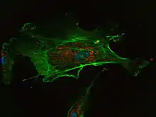In multicellular organisms, cells can move during processes such as wound healing, the immune response and cancer metastasis. For example, in wound healing in animals, white blood cells move to the wound site to kill the microorganisms that cause infection. Cell motility involves many receptors, crosslinking, bundling, binding, adhesion, motor and other proteins.[29] The process is divided into three steps: protrusion of the leading edge of the cell, adhesion of the leading edge and de-adhesion at the cell body and rear, and cytoskeletal contraction to pull the cell forward. Each step is driven by physical forces generated by unique segments of the cytoskeleton.[30][31]