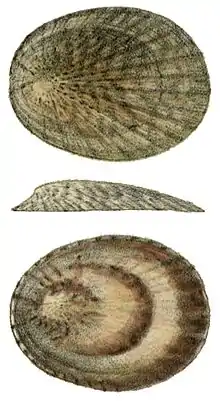 Drawing of the shell with dorsal view, lateral view (left side) and ventral view. Head region is on the left.