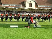On the last two weekends in September and the first weekend in October, the State Stud of Celle puts on a stallion parade or hengstparade. The parades are a major tourist attraction every year. The tradition of exhibiting all the state-owned sires to the public began in 1908.[9] Stallions perform in a variety of acts, some showcasing their performance capabilities in dressage or show jumping demonstrations, while others are shown in-harness. Highly coordinated, color-matched drill teams are perennial favorites. The parade is an opportunity for the stud to showcase the less competitive talents of the stallions, as well. Stallions may be driven in groups of up to thirteen at a time, or in trick-riding formations called "Roman riding."[10] For many years, the solid black Escudo II performed tricks on cue with a handler, without a saddle or a bridle.