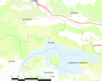 The village sits on the bank of Lac du Salagou. When the dam that created the lake was built (1964–68), the intention was to raise the water level in two stages—first to 139m, then to 150m. The second stage would have engulfed the village of Celles, which is at a mean altitude of 144m, and accordingly the village and its vineyards were officially abandoned. The first stage of water level left the water lapping at the foot of the village without encroaching on any structures. The second stage was never implemented, so a few villagers re-occupied the Mairie, repairing public buildings in order that the status of Celles as a commune would be preserved. However, the French authorities are allowing the village to decay and all buildings except the Mairie and the church are in ruins. It is a popular place for fishing and picnics.