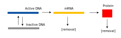As many quantities of cell biological interest are present in discrete copy number within the cell (single DNAs, dozens of mRNAs, hundreds of proteins), tools from discrete stochastic mathematics are often used to analyse and model cellular noise.[31][32] In particular, master equation treatments – where the probabilities of observing a system in a state at time are linked through ODEs – have proved particularly fruitful. A canonical model for noise gene expression, where the processes of DNA activation, transcription and translation are all represented as Poisson processes with given rates, gives a master equation which may be solved exactly (with generating functions) under various assumptions or approximated with stochastic tools like Van Kampen's system size expansion.