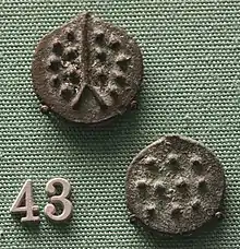 In the case of cast coins, a series of clay moulds joined by runners were used.[13] The patterns on the coins were produced by pressing a pattern into the clay or, in simpler cases, scratching lines in it.[13] Molten metal would then be poured into the moulds.[13] Once the metal had cooled, the moulds would be broken to access the coins.[13]