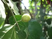 Tree is capable of growing up to 25 metres (82 ft) tall, the trunk is usually cylindrical with a fairly compact crown, the bark is light grey and smooth with narrow buttressed roots, brown patches left when thin scales defoliates from bark.[1] Leaves are simple in arrangement with a coriaceous and scabrid surface, the stipules is 4–5 mm long and it is pubescent; the leaf-blade is broadly ovate in outline, about 5–7 cm long and 2–4 cm wide, the apex is acuminate to rounded and the base is cordate, the petiole is 4–6 mm long; margin entire, the stomata is unequalled cell type, meaning it is anisocytic. Yellow-green flowers are in axillary cymes. The fruits is a globular drupe, 8–11 mm long with an endocarp that is greyish in color and ovoid in shape[1]