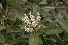 Cenarrhenes nitida forms an erect shrub to small tree ranging in height from 10 m (33 ft) in sheltered sites such as rainforests to 2 m (6.6 ft) in exposed sites.[8] Its leaves, which are roughly 8 to 12 cm long, are thick, dull and hairless with a cleanly serrated edge and rounded tip. These are attached to the stem via a short stalk. The leaves are spread along the branches and have a nauseating stale-cabbage smell when crushed which helps distinguish it from Anopterus glandulosus (Escalloniaceae) which looks similar but lacks the smell and the leaves are often longer and arranged in false whorls.[9] The leaves turn black when dried.[9][10][11]