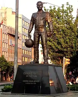 A former Turkish Air Force base located near İzmit, currently in use as Cengiz Topel Naval Air Station, is named after him. A monument was erected on the coastal road in the village Gemikonağı near Lefke in Northern Cyprus, where he had landed by parachute.[3] A bronze statue in Eskişehir depicts him in flight suit. A number of places,[4][5][6][7] schools[8][9][10] in Turkey and a hospital in Northern Cyprus[11] are named after him.