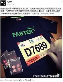 To publicise its involvement in the 2015 Hong Kong marathon, Puma posted an image of a facsimile runner's identification tag bearing the number "D7689" onto its Facebook page. One supporter of the Loving Hong Kong movement objected to the number, writing to the global CEO of the manufacturer saying that it was disrespectful to chief executive CY Leung and threatened to initiate a mass boycott of the company's sportswear.[70][71] The complainant explained that "689 is the code of the current CE of HKSAR well understood by HK people. D7 has the similar phonics in Cantonese as the 'F***' word".[71] The company declared its political neutrality, and deleted the post.[70] Lampooning the complaint, members of the public scoured the city and found many examples of innocent occurrences of the irreverent number.[72] MTR staff were warned after one such example found, of a carriage bearing the "D689" marking, posted to their unofficial MTR Service Update page on Facebook.[72][73]