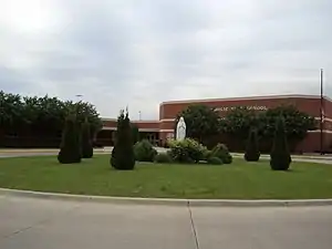 Church officials began discussing sites for a new school building in 1996, initially considering a west side location in the former Chicago & Alton railroad yards.[44] This site was later rejected due to the large amount of environmental cleanup needed.[45] In February 1998, school officials announced plans to construct a new school building in east or southeast Bloomington after renovation of the current building was deemed to expensive.[43][46] That July, the pastors' board announced fifteen acres of Deneen family farmland in east Bloomington were reserved for a new school building.[47] An $11 million fundraising effort to build a new school on the land gifted to the diocese began in 2001.[5][48]