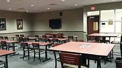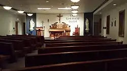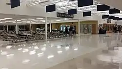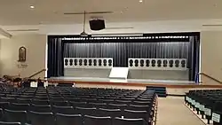 Enclosing more than 100,000 square feet[13] with a capacity for 500 students,[63] the school building is divided into two wings.[13] The academic wing contains sixteen classrooms, four science labs, two art labs, computer lab, and the student center. The social wing is bounded on one end by the 1400-seat Cvengros Gymnasium and on the other by the performing arts center - a 560-seat auditorium, audio lab, band room, and chorus room. Between are a 100-seat chapel, cafeteria, commons area, faculty dining area, welcome center, main office, weight room and four locker rooms.[13][23][61]