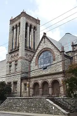 The stone portion of the church was built during 1893 to 1894; brick portions were added in 1952. It is notable as "the major surviving Richardsonian Romanesque structure in Lexington"; it was designed by architects Edwin W. and Frank L. Smith.[4]