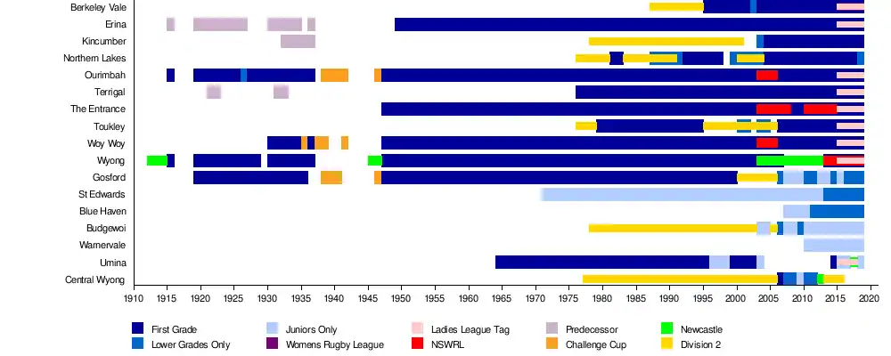 Current clubs Ourimbah, Wyong and later Woy Woy participated in the Central Coast Rugby League competitions that were held in 1915 and between 1919 and 1936. Teams from Gosford, Erina, Kincumber and Terrigal also competed, predecessors to the current clubs. The following teams were also involved:
