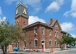 The Central Fire Station is located at the southwest corner of Leonard and School Streets in the city's central business district. It is a handsome brick 2-1/2 story structure, with a hip roof that has centered gables on its street-facing sides, and a mansard-roofed tower at the southwest corner. The main facade faces Leonard Street, and is dominated by four equipment bays, divided by granite piers and topped by granite lintels. Windows above are symmetrically arranged, with two segmented-arch windows in the center, and flat-arch windows flanking, with a pair of round-arch Italianate windows in the gable.[3]