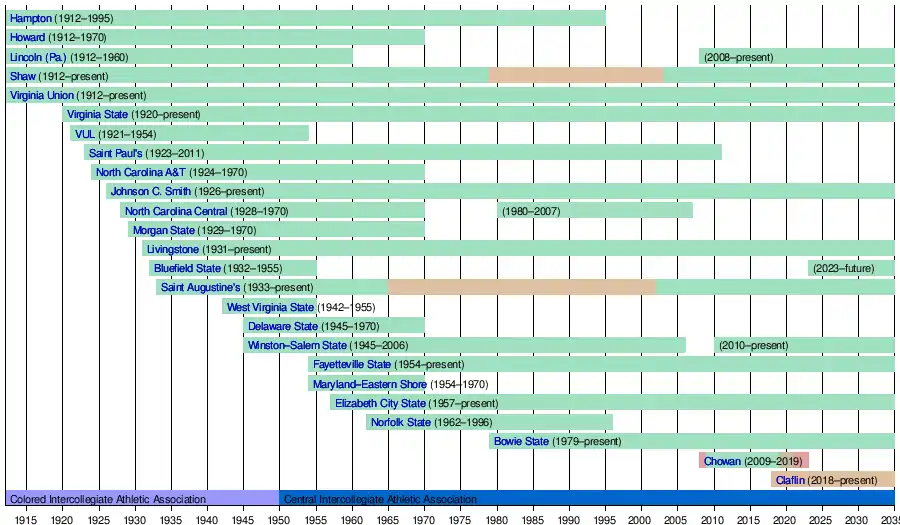 - North Carolina Central previously withdrew from the CIAA from 1970–71 to 1979–80.