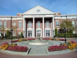 From 1923 to 1959, Central High School was located on Elizabeth Avenue at Kings Drive, where Central Piedmont Community College is now located. In 1959, its students moved into the new Garinger High School.[6] With the building vacant, Charlotte College (later University of North Carolina at Charlotte, UNCC) used the space. Starting in 1959, the Central Industrial Education Center shared the old high school. As a result of the 1963 N.C. Community College Act, the Central Industrial Education Center and the black Mecklenburg College combined to become Central Piedmont Community College.[7] The three-story Central High building is now the oldest building on the CPCC campus. CPCC trustees in July 2002 approved changing the building's name from Garinger Hall to the Central High School building, and a fund-raising campaign for the building's renovation was planned.[8] The Central High School Legacy Fund funded renovation of the Central High building, used for administrative offices and admissions, and provided scholarship money.[9] A rededication took place September 30, 2007, after restoration of the original facade.[6]