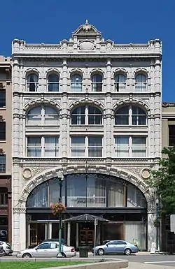 As the 20th century dawned, builders and architects concentrated their efforts in the northern half of the district, primarily on commercial structures as the downtown area was no longer popular as a place for new residences. Monument Square, created in 1891 when a statue of Columbia was erected atop the Soldiers' and Sailors' Monument in the triangular area formed by the intersection of Broadway, River and Second streets, became a new focal point of development.[41] There the McCarthy Building on Monument Square, and the similar National State Bank and Ilium buildings on Broadway, all built in 1904, show the decorative influence of the era's revival styles.[42][43][44][45] Proctor's Theater, ten years later on Fourth Street, continued the tradition.[1][46]