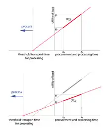 - The amount an individual is willing to process is proportional to traveling time. This is evident in and in the equation above. Since is the amount of time it takes an individual to process something to an additional stage, and this is independent of the amount of time it takes one to initially procure the resources, and since is positive, then increasing it will result in an increase in .