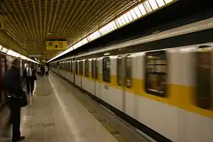 Centrale FS is a station on Lines 2 and 3 of the Milan Metro in Milan, Italy. The Line 2 station was opened on 27 April 1970 as a one-station extension from Caiazzo. On 21 July 1971, the line was extended to Garibaldi FS.[2] The Line 3 station was opened on 1 May 1990 as part of the inaugural section of the line between Duomo and Centrale. Initially, Duomo was connected with Centrale by shuttle service, and on 16 December 1990, with the extension of the line to Porta Romana, full-scale service started. The station remained the terminus of Line 3 until 12 May 1991, when Sondrio was opened.[2]
