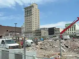On June 25, 2009, the process of seeding and filling the City Center construction site began. On September 10, 2013, EOP, the architecture firm behind the fifth iteration of the City Center design announced they were pulling out of the project.[6] Preliminary construction began in December 2013 and blasting for the parking structure and foundation began on March 17, 2014.[7] The 700-space underground parking garage was expected to be completed by late summer 2014, but was not.[8] Developers then attempted to sell $30 million in bonds solely devoted towards building the parking garage.[9] Though construction on the parking garage was slow, the garage was ultimately finished in late 2017 and then first beam of the above-ground portion of the project was erected on December 19, 2017.