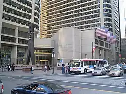 Centre Square has been the home to numerous works of contemporary art. Until the company left in the mid-1980s, Arco Chemical Co., whose headquarters was in Centre Square, had a large collection of contemporary art displayed throughout the complex.[8][12] Philadelphia has a percent for art program, which requires that a percentage of construction costs be allocated for art.[13] A fan and collector of contemporary art, developer Jack Wolgin had three pieces commissioned to fulfill the ordinance.[3] The most famous piece is Claes Oldenburg's 45 feet (14 m) Cor-Ten and stainless steel sculpture, Clothespin.[3][14] Located atop the subway entrance in the plaza in front of the building, Centre Square is best known because of Clothespin and is often called the Clothespin Building.[15] Wolgin's lawyer said the lead tenant, the First Pennsylvania Bank, had requested a conventional statue of a general on a horse, but Wolgin said, "No. You're getting a clothespin."[3] A second sculpture was also commissioned. The steel sculpture Milord la Chamarre by Jean Dubuffet was placed in the atrium. In the mid-1980s the interior was renovated and Milord la Chamarre was moved outside on Market Street. Also commissioned were eight banners by Alexander Calder. The banners, ranging from 18 feet (5.5 m) to 28 feet (8.5 m), were hung from the atrium ceiling and had colorful sun, flower, moon and night designs. The dyed cotton and silk banners, the only banners Calder ever designed, were removed during the renovations in the 1980s and were subsequently lost. After pressure from the Philadelphia Redevelopment Authority art program to search for the banners, they were discovered in a storeroom in the early 2000s. In 2009 some of the banners were put on temporary display at the Free Library of Philadelphia while the Redevelopment Authority works to find a place to have them displayed permanently.[3][16]
