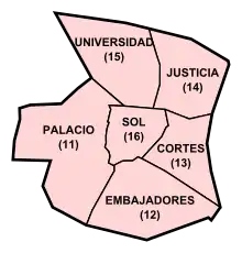 Centro is a district of Madrid, Spain. It is approximately 5.23 km2 (2.02 sq mi) in size. It has a population of 149,718 people and a population density of 28,587/km2 (74,040/sq mi). It roughly corresponds to the bulk of the housing formerly enclosed by the so-called Walls of Philip IV.[1] The district is made up of the neighbourhoods of Cortes, Embajadores, Justicia, Universidad, Palacio and Sol.