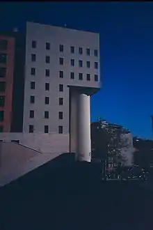 In the Fontivegge neighborhood, near the railway station, there is a complex of postmodern buildings,[1] with the Centro Direzionale della regione Umbria (management centre of the Umbria region). It is also called “Broletto”, because it has the function of a public palace, as the Lombard Arengo (a place dedicated to the meeting of the citizens). It was designed in 1983 by the internationally renowned architect and designer Aldo Rossi to substitute another huge project of 1980, greater in volume, never realized because too expensive.