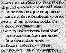 Except for folio 11, which is missing a strip at the bottom of the leaf, the leaves are 430mm by 340mm. The text is written in two columns of 44 lines in an uncial hand. The script and the text both bear a remarkable similarity with the Codex Amiatinus, although there are some corrections in the Ceolfrid Bible not in the Codex Amiatinus. The text is arranged "per cola et commata", that is, the length of a line serves to clarify the sense of the text. The text is divided identically as the text of the Codex Amiatinus. The first lines of each chapter are written with red ink. The beginning of the Fourth Book of Kings is marked by an enlarged initial P decorated with red dots. In the margin next to the initial P there is a Chi Rho monogram flanked by the Greek letters Alpha and Omega. Punctuation was added to the text at a later date. In the 14th century modern chapter numbers were added along with a note between the end of the Third Book of Kings and the Beginning of the Fourth Book of Kings which reads Explicit Regum liber tercius. Incipit quartus. Prevaricatus est etc.