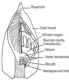Cephalochordates have developed a filter feeding system, called the oral hood, that serves as the entrance for incoming food particles. The free edge of the oral hood contains Buccal cirri, small filament-like projections, that assist in sifting out larger food particles before they enter the buccal cavity.[5] These projections are chemoreceptors that stimulate the epithelial cilia lining inside the walls of the oral hood to bring food particles into the mouth. The coordinated movement of several ciliated tracts help facilitate food ingestion through a rotating motion that is similar to that of a wheel, causing cilia to be referred to as “wheel organ”.[5] One of these ciliated tracts located on the oral hood forms a ciliated cavity, called Hatschek's pit, which aids in food collection by secreting mucous into the buccal cavity to capture food particles. Located behind the buccal cirri is the velum, which acts as an internal filter before food enters the pharynx. The food particles adhere to secreted mucus on the pharyngeal bars before transferring to the epibranchial groove on the dorsal side of the pharynx.[5] Food particles are then transported to the gut while excess water is pumped out of the pharynx through the pharyngeal slits. The excess water excretes from the body using a single atriopore of the atrium.[5]