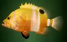 Cephalopholis igarashiensis has a deep body with the depth of the body being greater than the length of the head, the standard length is 2.0 to 2.4 times the depth of the body. The dorsal profile of the head is straight or marginally concave to beyond the eye while the nape is distinctly convex. The preopercleis rounded and the edges have fine serrations although those on the ventral margin are slightly less fine giving it a more irregular appearance but the serration remain enclosed within the skin.[3] The dorsal fin contains 9 spines and 14 soft rays while the anal fin has 3 spines and 9 soft rays.[2] The caudal fin rounded. The overall colour of this species is reddish-orange and it has seven wide, lemon-yellow bars on the upper flanks which reach onto the dorsal fin, and three wide yellow irregular oblique stripes on the head. The juveniles are yellower, darkening on the lower body, and they have several white bars on the body and a large black eyespot on the soft rayed part of the dorsal fin. They also have blackish pelvic fins, and a black area at the base of the anal fin.[4] This species attains a maximum standard length of 43 centimetres (17 in)>,[2] but a more common length is 25 cm (10 in).