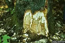 Ceratocystis coerulescens enters its host through wounds, especially wounds in buttress roots and lower trunk. All diseased trees have been found to have man-made wounds from tapping and/or driving and dragging logs over them. Therefore, it's believed that the trees successfully combat the pathogen when it enters wounds higher up made by animals, insects, or weather. Sapstreak disease is commonly associated with the presence of opportunistic fungi Armillaria and/or Xylaria.[2][3]