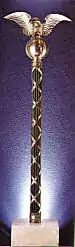 The present mace is modeled on that of the House of Commons of the United Kingdom, differing only in that one of the panels instead depicts the Southern Cross and the initials "NZ".[33] The mace is 1.498 metres long, made of sterling silver coated with 18 carat gilt gold and weighs 8.164 kilograms.[29][31][34]
