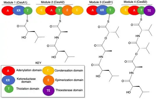 CesA is a 387 kDa heterodimer protein composed of CesA1 and CesA2 modules. CesA1 adds ketoisocaproic acid to the adenylation domain. The thiolation domain will then move the ketoisocaproic acid along the ketoreductase domain, which reduces ketoisocaproic acid into D-α-hydroxyisocaproic acid with the cofactor NADPH. In module CesA2, L-alanine is added to the adenylation domain. The condensation domain will facilitate a nucleophilic attack by the free amine on L-alanine onto the thioester of D-α-hydroxyisocaproic acid (D-HIC) on the CesA1 module. This event links the peptides and situates the growing peptide molecule on the thiolation domain of CesA2. Next, an epimerization domain changes the stereochemistry of L-alanine (L-Ala) into D-alanine (D-Ala).[4]