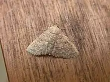 The wingspan is about 20 mm. Adults are pale brown, with pale broken zigzag lines outlined in dark grey across each forewing. There is a dark comma-shaped mark on the thorax and two black spots near the centre of each forewing.[3]