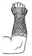 The basic Roman cestus was made of hard leather straps, which enclosed and protected the fighter's lower arm and fist. The straps could be studded, or more extremely, spiked. [6] Caestūs were usually worn in pairs. In Roman gladiator contests, cestus-fighters were probably matched against others of their kind; the cestus was effective protection and weaponry against other cestus fighters, and possibly against armoured gladiators equipped with other weapons.[7] Apart from the cestus itself, the cestus-fighter would probably have had no body armour.[8]