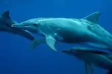 The Bottlenose dolphin is one of the most common cetacean species: its distribution is worldwide and it is observed in the three major ocean basins.[67] Its local adaptation and its complex social structure have produced a number of clearly differentiated populations, with morphological variations that are sometimes marked, particularly in coastal waters.[68][67]