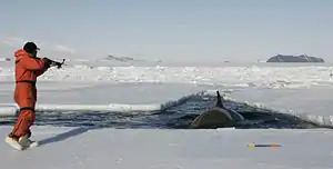 Studying cetaceans presents numerous challenges. Cetaceans only spend 10% of their time on the surface, and all they do at the surface is breathe. There is very little behavior seen at the surface. It is also impossible to find any signs that an animal has been in an area. Cetaceans do not leave tracks that can be followed. However, the dung of whales often floats and can be collected to tell important information about their diet and about the role they have in the environment.[1] Many times cetology consists of waiting and paying close attention.