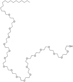 Cetomacrogol 1000 is the tradename for polyethylene glycol hexadecyl ether, which is nonionic surfactant produced by the ethoxylation of cetyl alcohol to give a material with the general formula HO(C2H4O)nC16H33. Several grades of this material are available depending on the level of ethoxylation performed, with repeat units (n) of polyethylene glycol varying between 2 and 20. Commercially it can be known as Brij 58 (when n=20) or Brij 56 (when n=10). Brij is a trademark of Croda International.