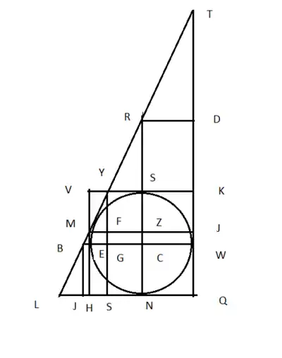 - TLQ, the large right angle triangle, with horizontal line LQ, vertical line TQ and hypotenuse TL