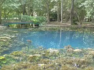 A major feature of the landscape park are the Fontaines Bleues, natural springs whose waters are an unusual brilliant hue of blue. There is also a round dovecote structure with a conical roof, dating from 1740, with fifteen hundred nesting holes.