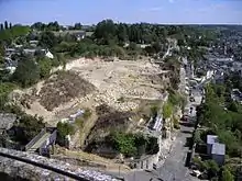 Standing on a rocky outcrop above the river Vienne, Château de Chinon has natural defences on three sides and a ditch dug along the fourth.[40] Writing in the 12th century, the chronicler William of Newburgh commented that even before Château de Chinon came under the control of Henry II "its strength was such that nature seemed to vie with human art in fortifying and defending it".[41] That said, in the 12th century Henry II undertook a project of rebuilding the castle and much of the extant remains date from this period.[11] The stone used to build the castle was quarried on the site.[42]