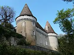 The chateau's appearance from the south-east is that of a lodge flanked by two wide round towers, all with machicolation.[1]