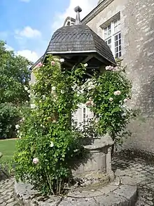 There are no accurate records currently available as to the extent of the building at this time, but a later drawing shows two wings, on either side of the tower. The east wing also extended north to meet the church. This section was known to have been further extended in 1638 by Isabelle Salviati whilst the church was being worked on.[21] The west wing was destroyed in a fire in 1723.[22] The joining edge can be seen on the northwest corner of the tower. The two wings and tower enclosed the great courtyard of the chateau that contains the well.[23] This is covered with a distinctive roof held on stone columns built in 1814 that has become emblematic of the chateau.