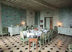 The 1st floor windows were enlarged and the corridors and interiors modified in the 1780s by the Burgeat family.[25] Later residents, the Stapfer, also built in a ground-floor room a place of worship (they were a strongly Protestant family), and there is still a wooden plaque over the fireplace inscribed "Cult Evangelical Protestant".[26]
