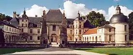 The foundations are in part those of the thirteenth-century château-fort. The rebuilding in Renaissance style is owing to the brother of the Admiral de Coligny, François de Coligny d'Andelot (1521–1569), who inherited the site in ruinous condition in 1547 and whose construction campaigns of 1555-1568 during the Wars of Religion, when Tanlay was a center of Huguenot resistance, left the residence uncompleted. Building was recommenced afterwards by Michel Particeli d'Hemery, the surintendant de finance under Mazarin, who completed the château to designs by Pierre Le Muet between 1643 and 1649.[1] Since 1700 the property has remained in the family of the man who was created marquis de Tanlay in 1705.