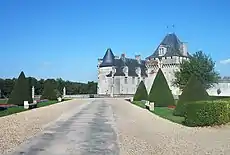 The château has a jardin à la française, redone in 1936–1939, featuring a terrace with an Italian gallery, a monumental stairway, a parterre with four compartments and a fountain, topiary, and statues. The property is entered via the Porte des Lions, an imposing 17th century edifice. Inside the moat is the keep, an ancient machicolated tower.