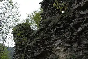 The remains comprise two parts: at the front, a square tower of two or three storeys, made in rough stones, measures 10 m on each side with walls 1.5 m thick. In the east are the remains of an outer work, and in the south is the access path.