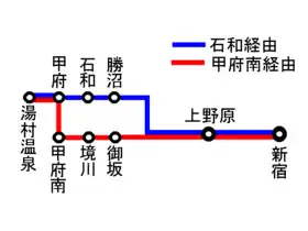 - Shinjuku Highway Bus Terminal (新宿) - Chuo Exp. Uenohara (上野原) - Kōfu Station (甲府), Yumura-Onsen (湯村温泉)