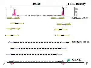 The ChIA-PET method combines ChIP-based methods,[2] and Chromosome conformation capture (3C) based methods,[3] to extend the capabilities of both approaches. ChIP-Sequencing (ChIP-Seq) is a popular method used to identify TFBS while 3C has been used to identify long-range chromatin interactions. Independently, both suffer from limitations in identifying de-novo long-range interactions genome wide. While ChIP-Seq is able to identify TFBS genome-wide,[4][5] it provides only linear information of protein binding sites along the chromosomes (but not interactions between them), and can suffer from high genomic background noise (false positives). While 3C is capable of analyzing non-linear, long-range chromatin interactions, it cannot be used genome wide and, like ChIP-Seq, also suffers from high levels of background noise. Since the noise increases in relation to the distance between interacting regions (max 100kb), laborious and tedious controls are required for accurate characterization of chromatin interactions.[6] Unlike 3C which is a locus-specific interaction profiling method, alternative methods such as Hi-C have been established to profile interactions genome wide.[7] Despite whole genome profiling methods for both TFBS and long range interactions, combining approaches with the ChIA-PET method allows for identification of genomic areas in which the protein of interest is bound as well as the genomic region which it interacts with.[8][9]