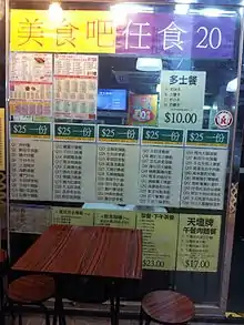 A cha chaan teng serves a wide range of food, from steak to wonton noodles to curry to sandwiches, e.g. Hong Kong-style French toast.[17] Both fast food and à-la-carte dishes are available. A big cha chaan teng often consists of three cooking places: a "water bar" (水吧) which makes drinks, toast/sandwiches, and instant noodles; a "noodle stall" which prepares Chiuchow-style noodles (including wonton noodles); and a kitchen for producing rice plates and other more expensive dishes.